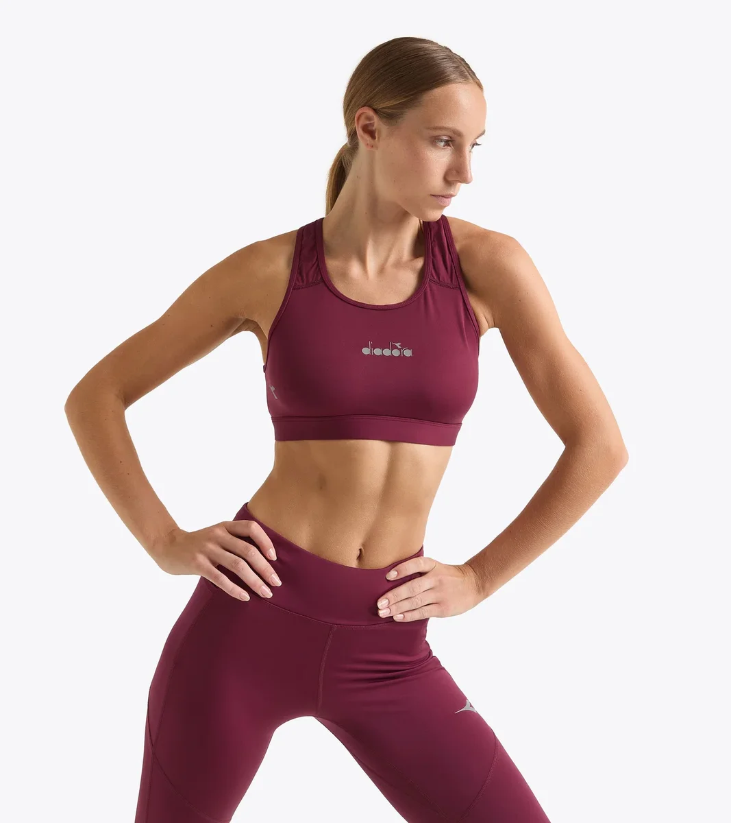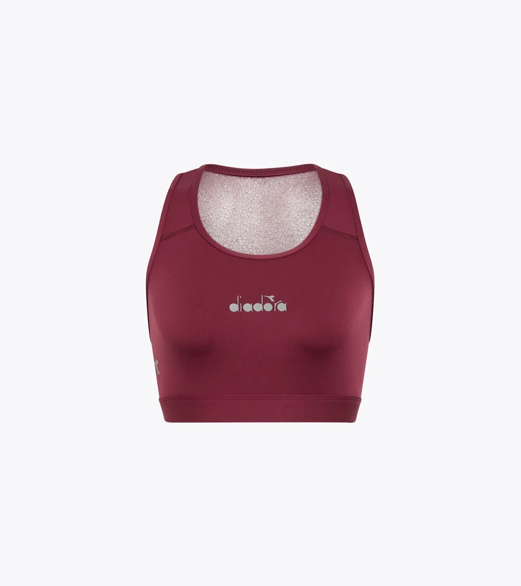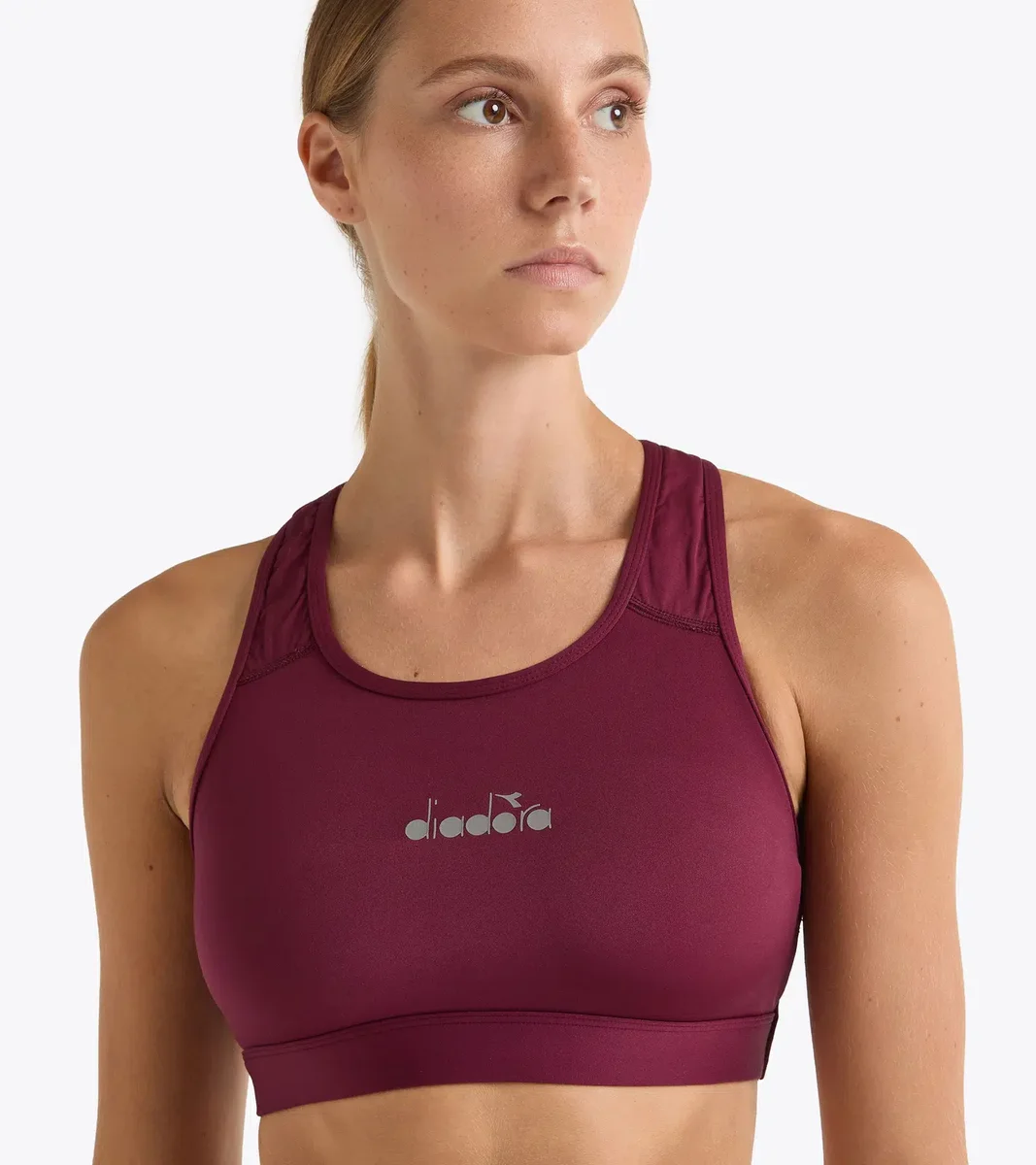 Trainings-BH aus einem dehnbaren, hochkomprimierenden Polyamidgewebe. Rückseite aus leichtem Mesh für einen Tüll-Effekt.