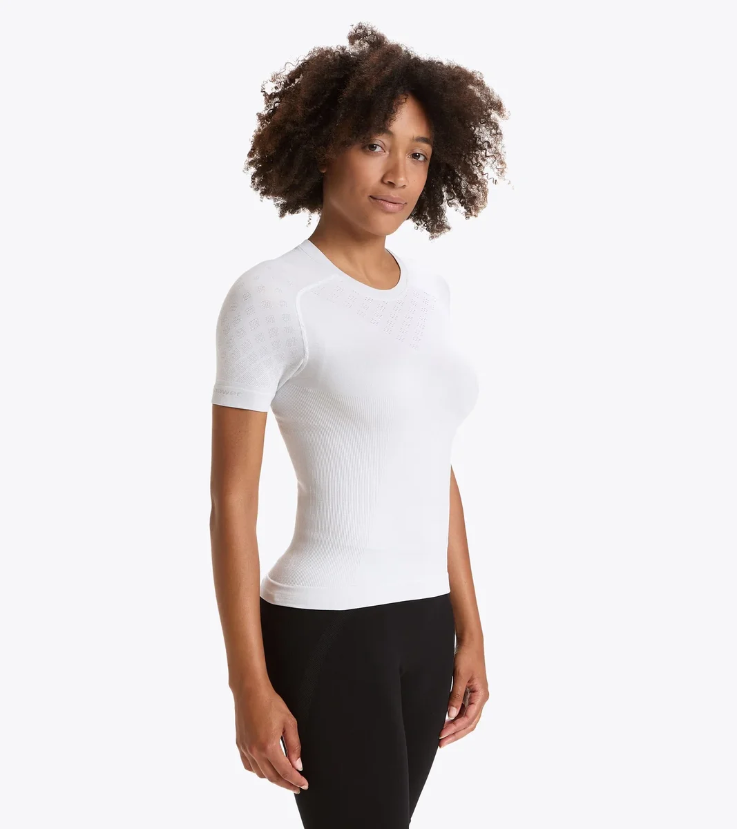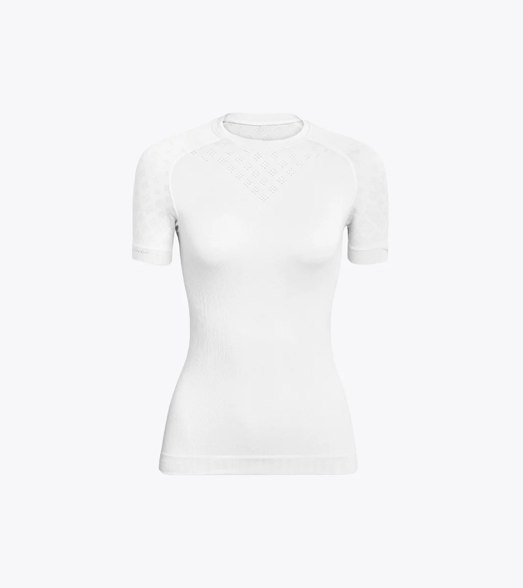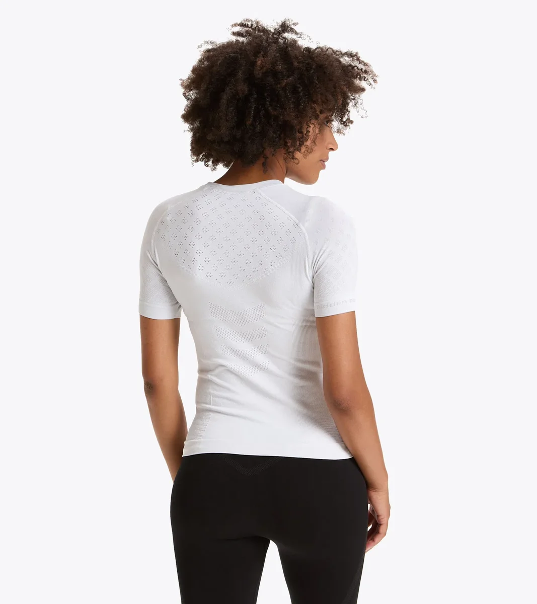 Ein kurzärmeliges Shirt mit Rundhalsausschnitt aus einer weichen, leichten Mischung aus Polyamid und Polypropylen. Letzteres – Ton in Ton – hat die doppelte Funktion, den Körper trocken zu halten und die Logos hervorzuheben.