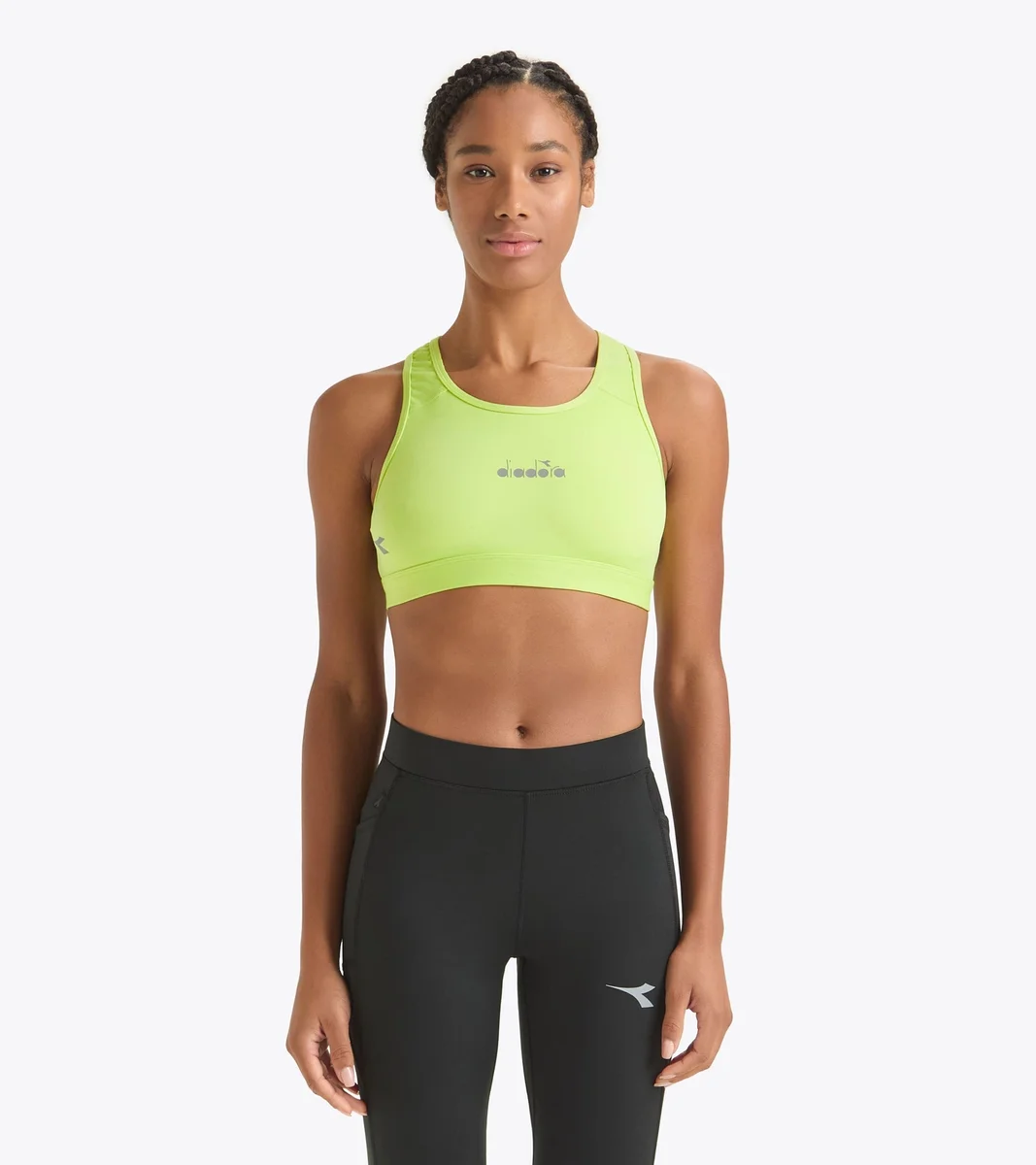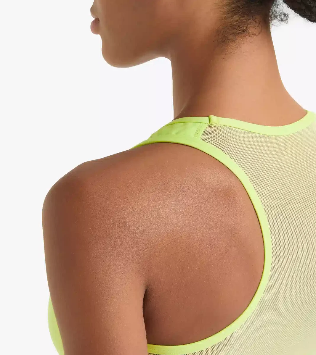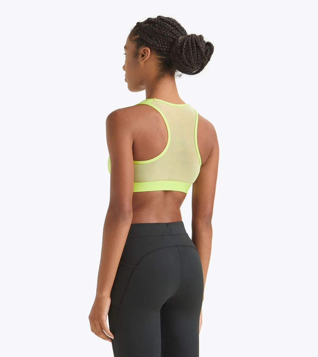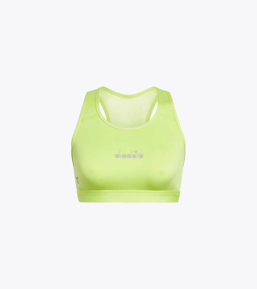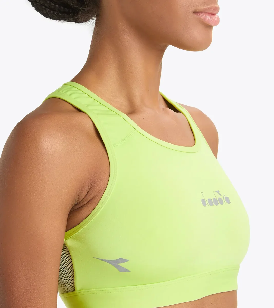 Trainings-BH aus einem dehnbaren, hochkomprimierenden Polyamidgewebe. Rückseite aus leichtem Mesh für einen Tüll-Effekt.