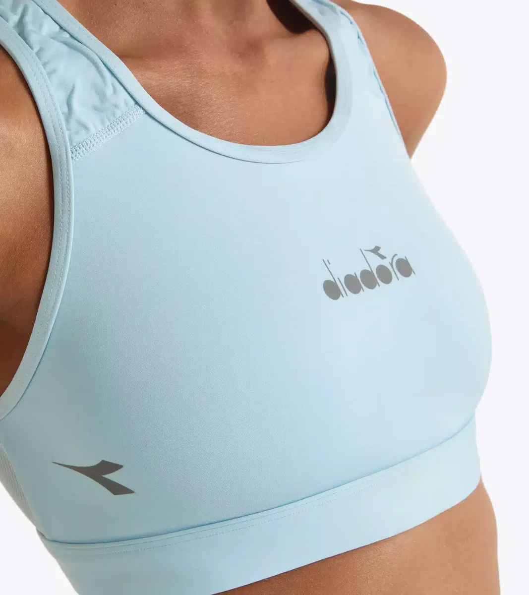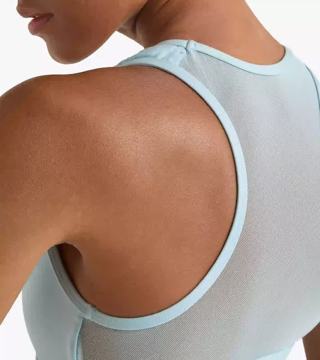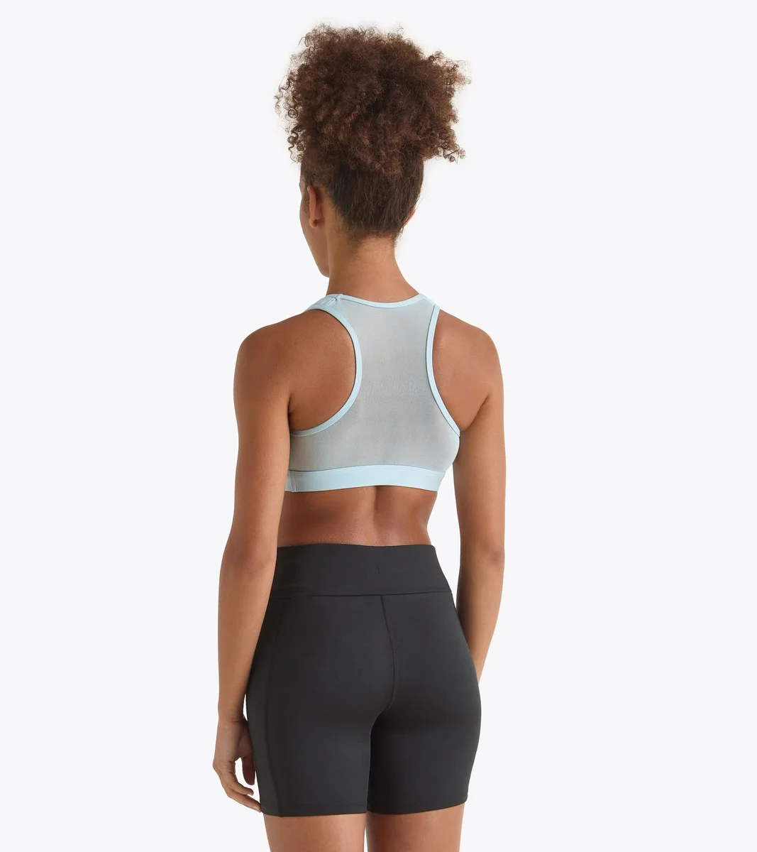 Trainings-BH aus einem dehnbaren, hochkomprimierenden Polyamidgewebe. Rückseite aus leichtem Mesh für einen Tüll-Effekt.
