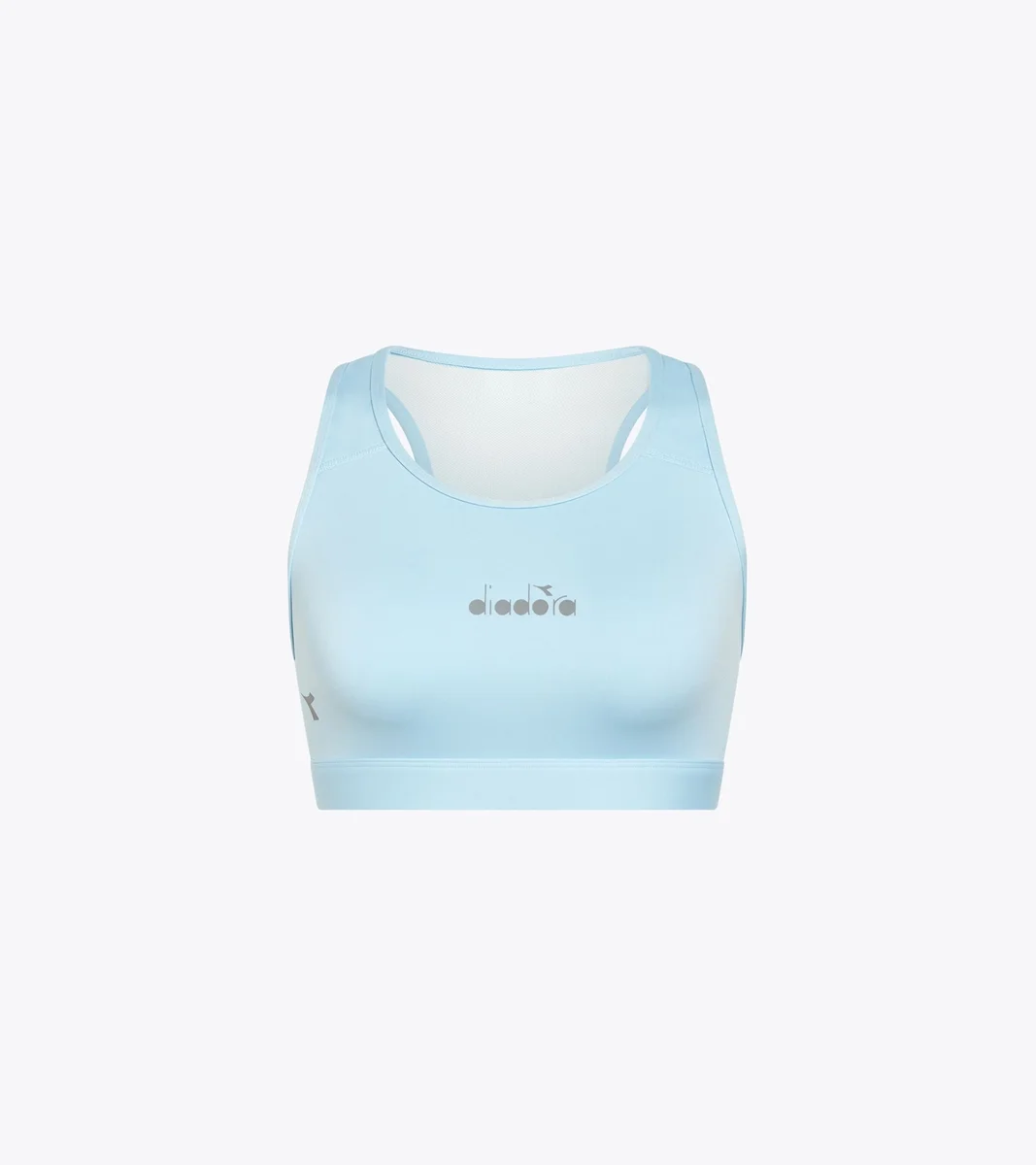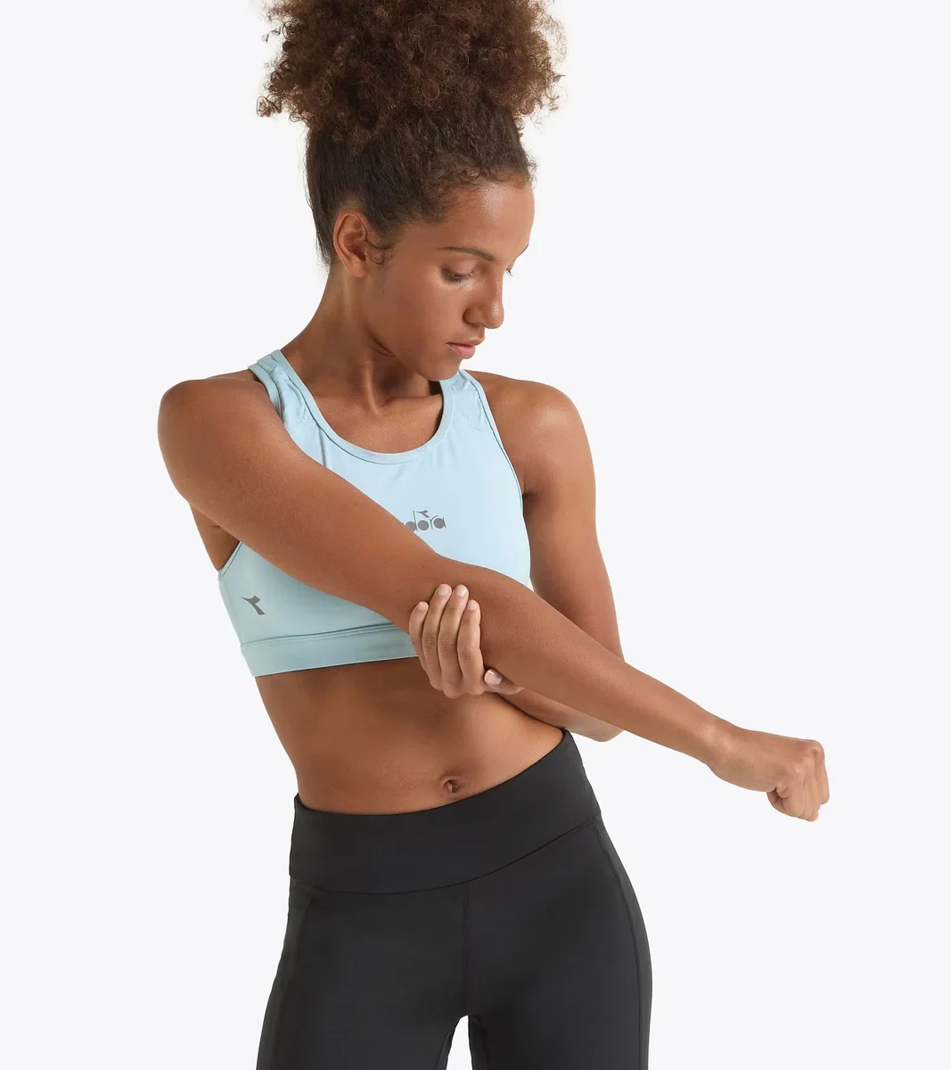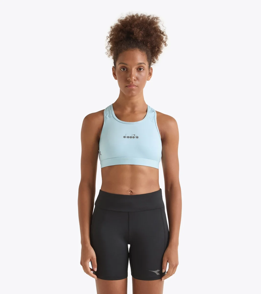 Trainings-BH aus einem dehnbaren, hochkomprimierenden Polyamidgewebe. Rückseite aus leichtem Mesh für einen Tüll-Effekt.
