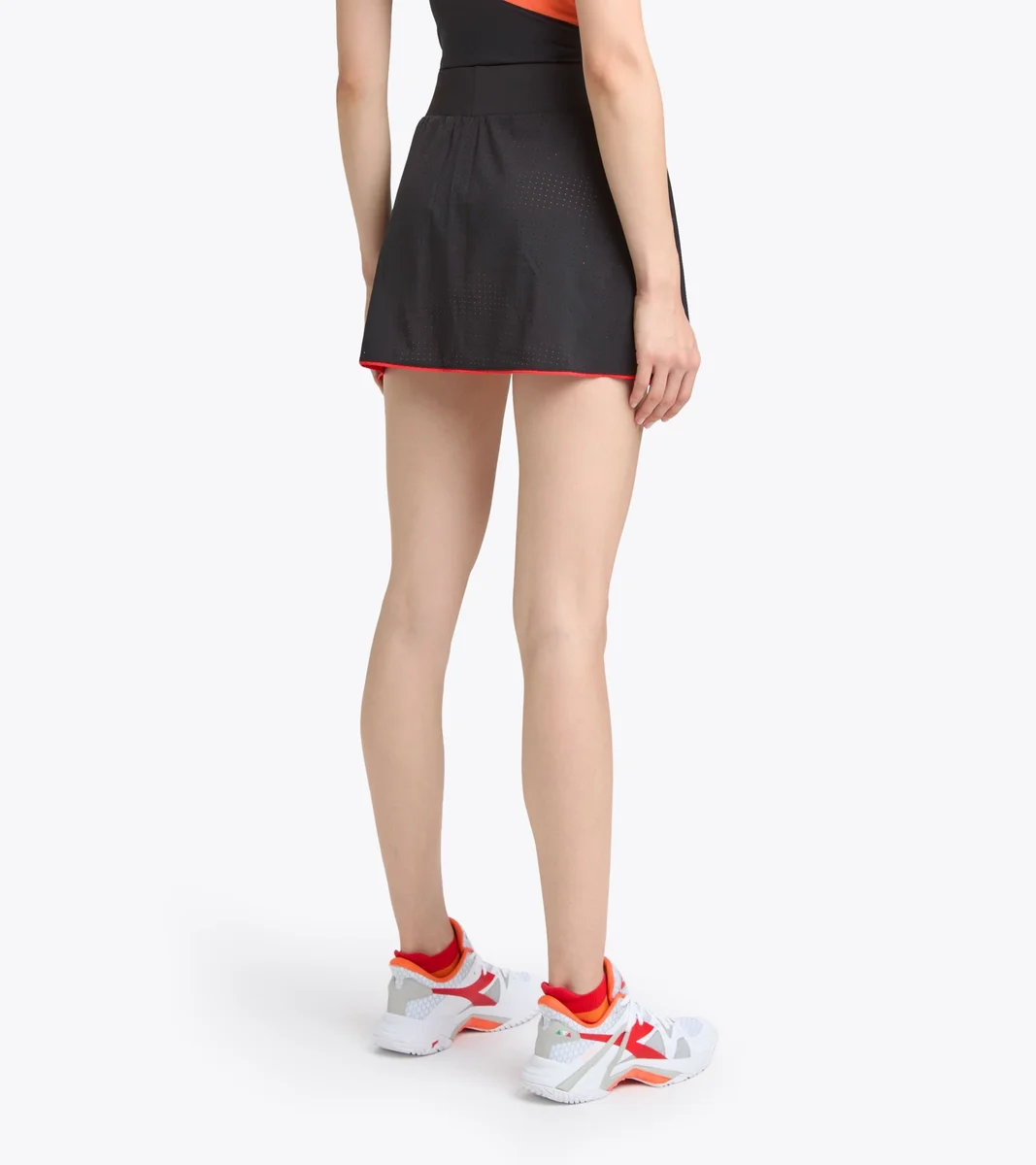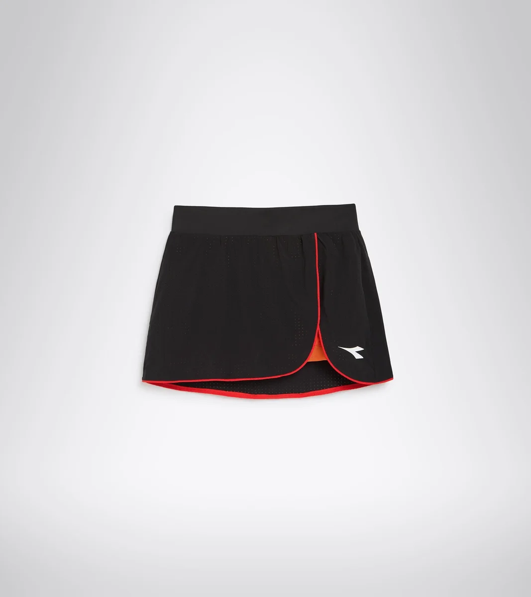 Tennisrock für Damen aus perforierter Mikrofaser mit tiefem Schlitz vorne und kontrastierenden Kanten. Die Shorts mit Tüll-Effekt-Mesh am Saum verfügen über seitliche Balltaschen. Das Branding entspricht den Regeln internationaler Turniere. Darüber hinaus verfügt das Material über die diadora dia dry-Technologie und bietet höchsten Komfort beim Sport, indem es den Körper trocken hält und Feuchtigkeit schnell von der Haut ableitet.