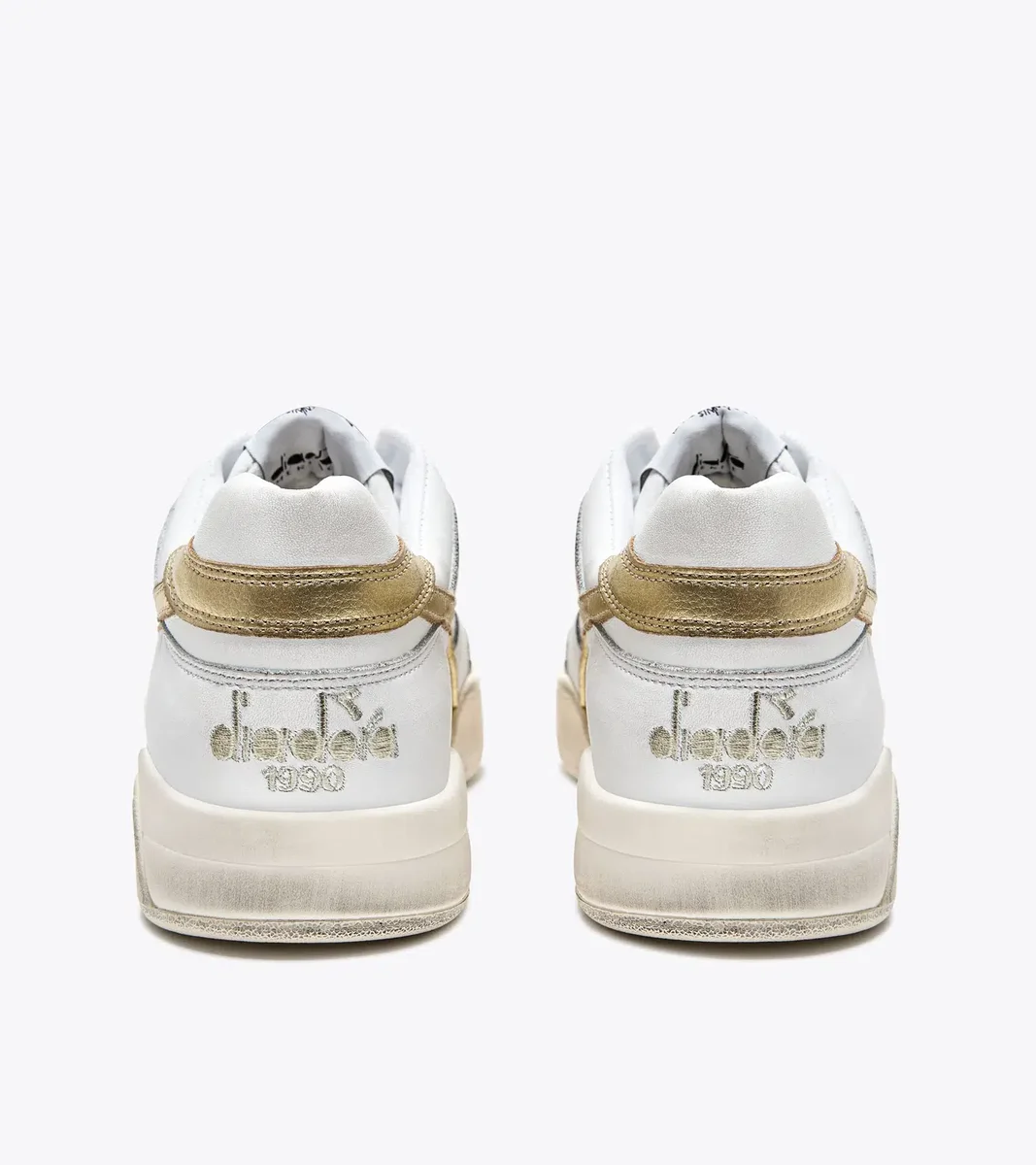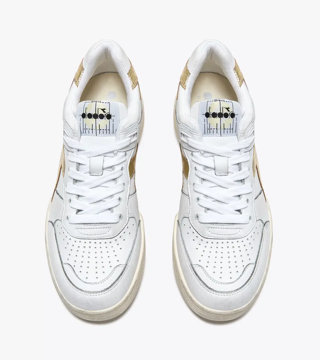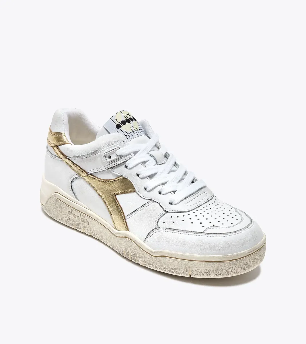 Manche sagen, dass Sneaker am besten aussehen, wenn sie schon getragen sind, aber dann gibt es den B.560 Laminated: ein perfektes Off-White-Finish direkt aus der Verpackung, das durch eine leichte Wachsbehandlung erzielt wird. Dieses Finish unterstreicht die Qualität des Obermaterials aus Vollnarbenleder und passt wunderbar zum laminierten goldenen Lederlogo.