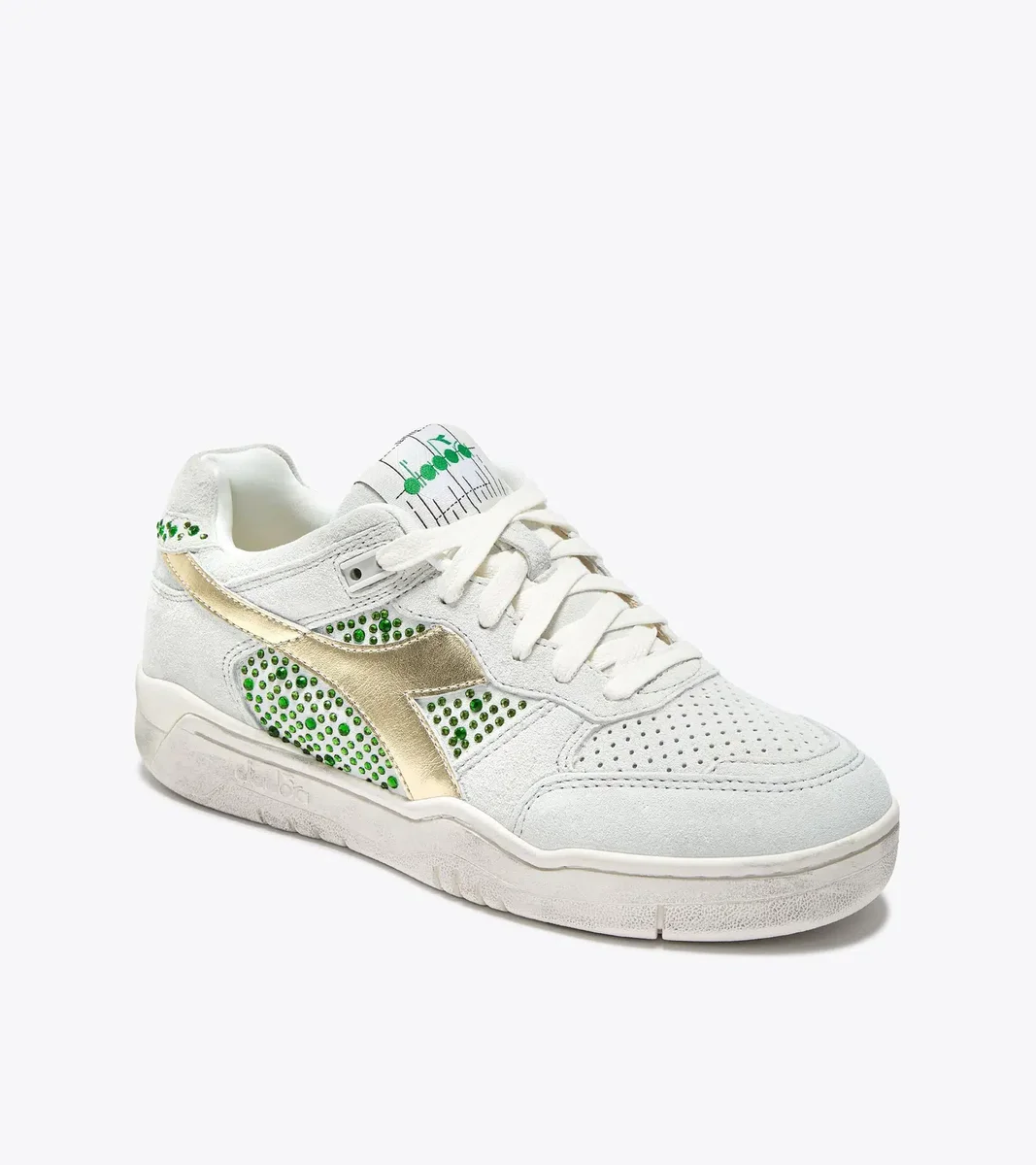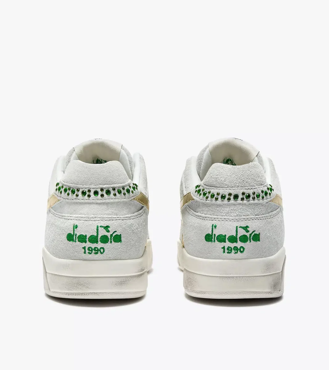 Der B.560 Studs Used WN ist die Königin der Kontraste. Auf der einen Seite verkörpert er ein ikonisches Design mit Wachsbehandlung, das an eine andere Ära erinnert. Auf der anderen Seite verlaufen kantige Nieten entlang des Seitenpanels und der hinteren Lasche und betonen das Diadora-Logo aus Metallic-Leder. Könnte dies die neue Ära des Tennisstils sein?