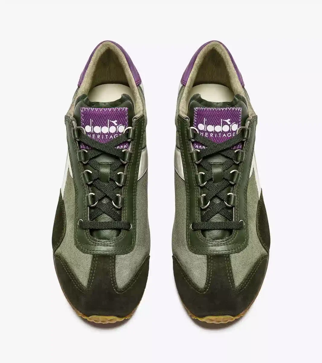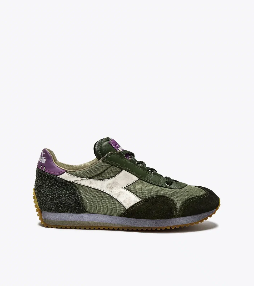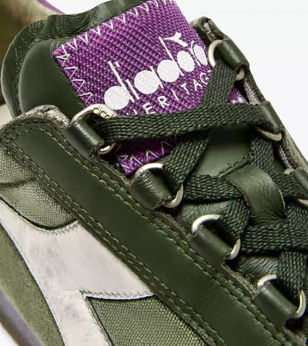 Laufmodell im Stil der 70er Jahre, direkt aus dem Diadora-Archiv von 1975. Ikonische Details wie die Metallösen sind dem ersten Diadora-Sportschuh nachempfunden. Hochwertige Materialien Aus Canvas und Wildleder, mit Zunge aus Leder. Stonewash Ein typisches Detail der Diadora Heritage-Sneaker: Die Stonewash-Behandlung macht das Leder weicher. Dirty-Effekt