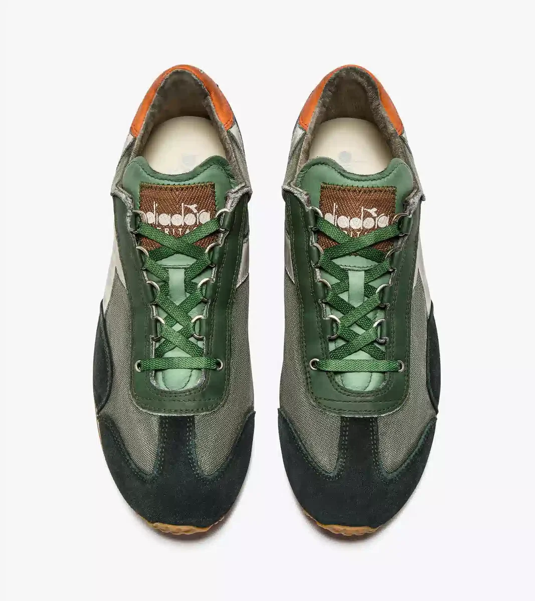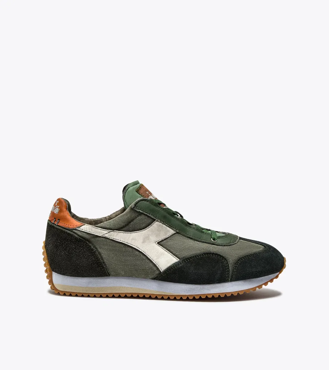 Laufmodell im Stil der 70er Jahre, direkt aus dem Diadora-Archiv von 1975. Ikonische Details wie die Metallösen sind dem ersten Diadora-Sportschuh nachempfunden. Hochwertige Materialien Aus Canvas und Wildleder, mit Zunge aus Leder. Stonewash Ein typisches Detail der Diadora Heritage-Sneaker: Die Stonewash-Behandlung macht das Leder weicher. Dirty-Effekt