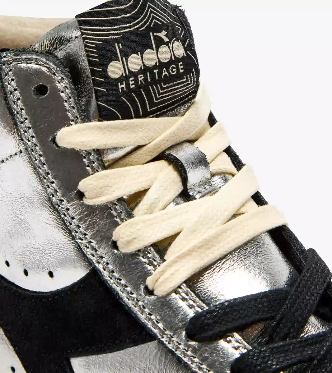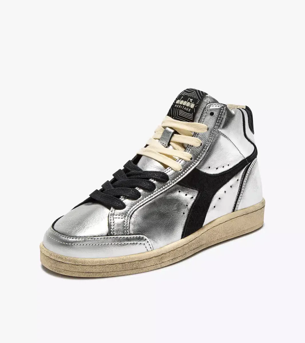 Der Prestige High Metal Used ist aus laminiertem Leder mit Details aus Schweinsleder gefertigt. Die Stonewash-Behandlung macht das Material weicher, während ein leichtes Wachsfinish dem Schuh seinen unverwechselbaren Used-Look verleiht – ein Markenzeichen der Diadora Heritage-Linie.