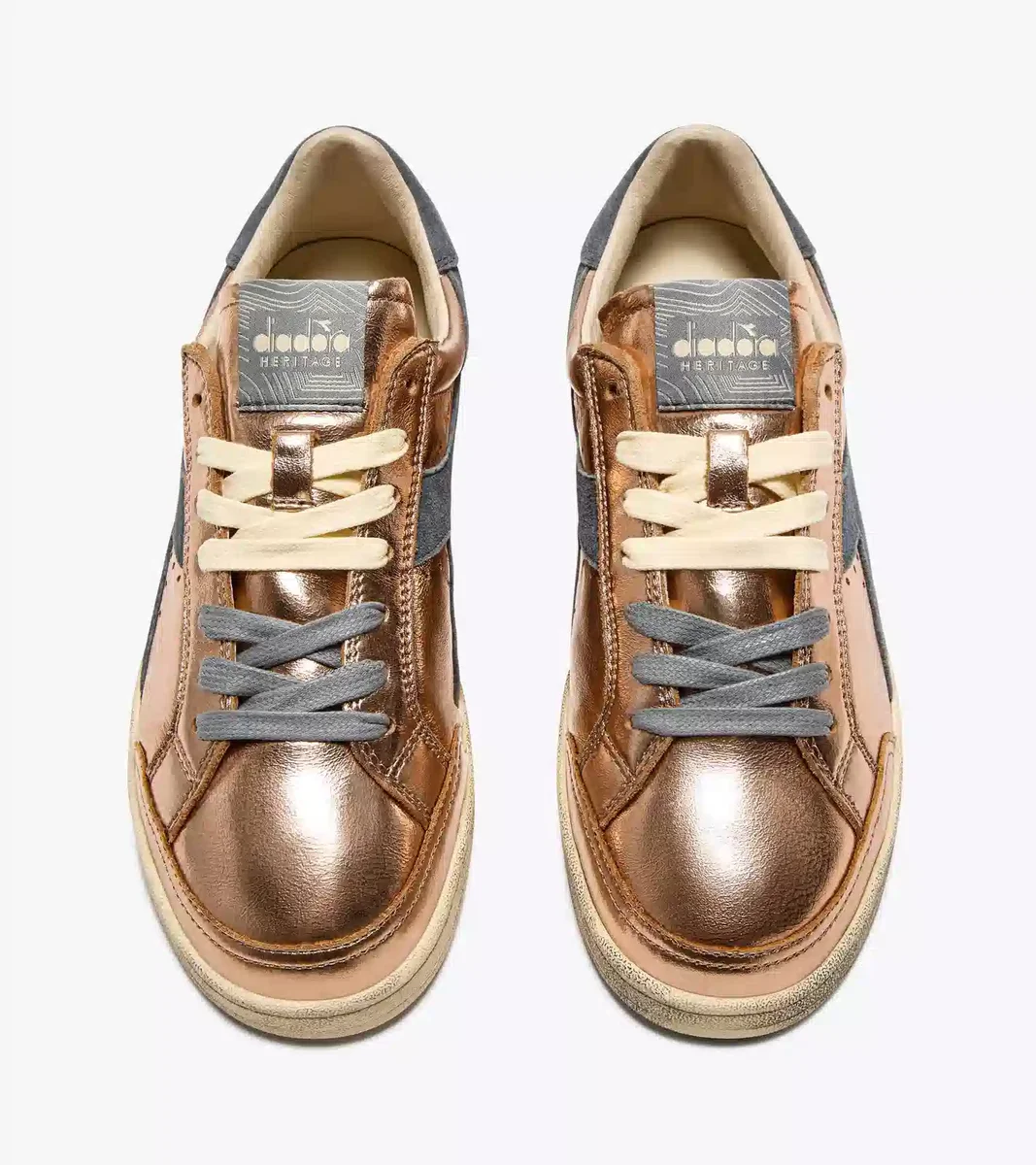 Prestige Metal Used ist aus laminiertem Leder mit Details aus Schweinsleder gefertigt. Die Stonewash-Behandlung macht das Material weich, während ein leichtes Wachsfinish dem Schuh seinen unverwechselbaren Used-Look verleiht – ein Markenzeichen der Diadora Heritage-Linie.
