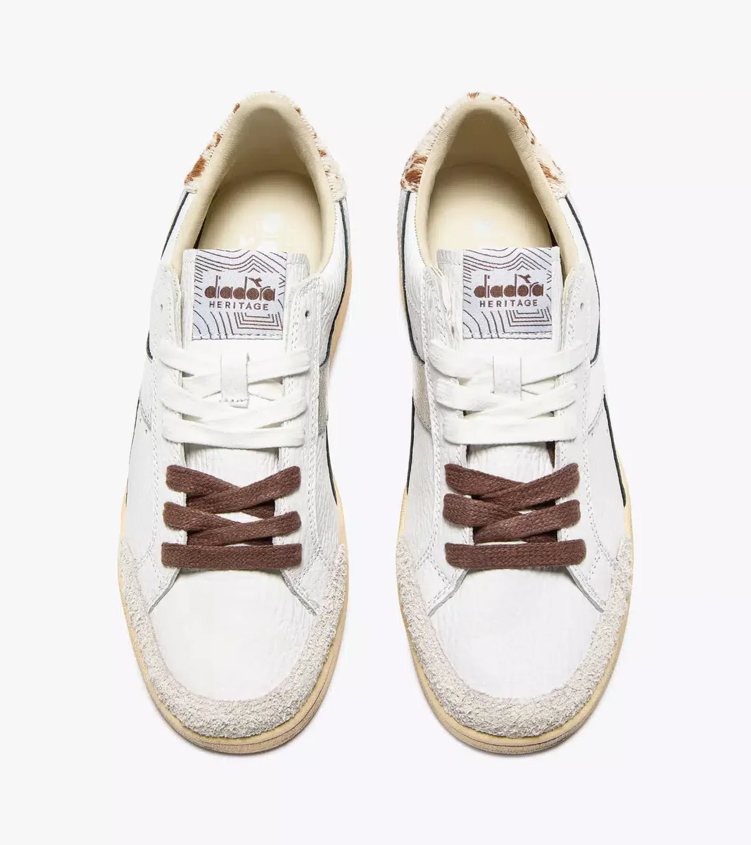 Prestige Safari WN besticht durch eine Fersenlasche mit Animalier-Details aus Pferdeleder – ein perfekter Kontrast zum glänzenden laminierten Logo. Eine leichte Wachsbeschichtung verleiht ihm den unverwechselbaren Used-Look, das exklusive Markenzeichen der Heritage Sneakers.