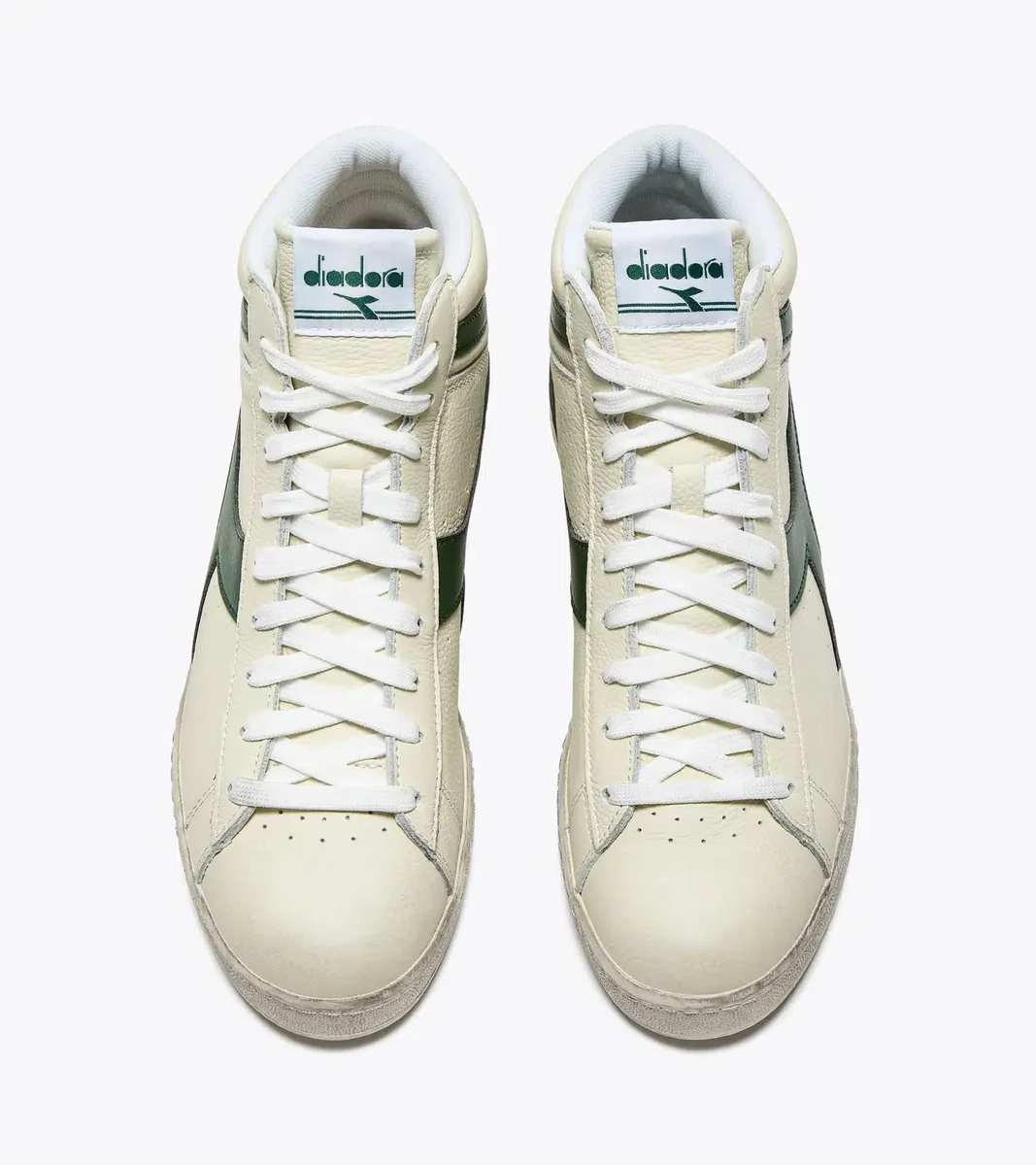 Das ikonische Modell Game L High ist aus hochwertigem Leder mit Wachsbehandlung gefertigt. Wie alle Ikonen von Diadora besticht dieser Schuh durch seine sportliche Ästhetik und seinen zeitlosen Stil, der zu jedem Anlass passt. Unisex-Modell mit kontrastierendem 5-Ball-Logo und Fregio-Detail.