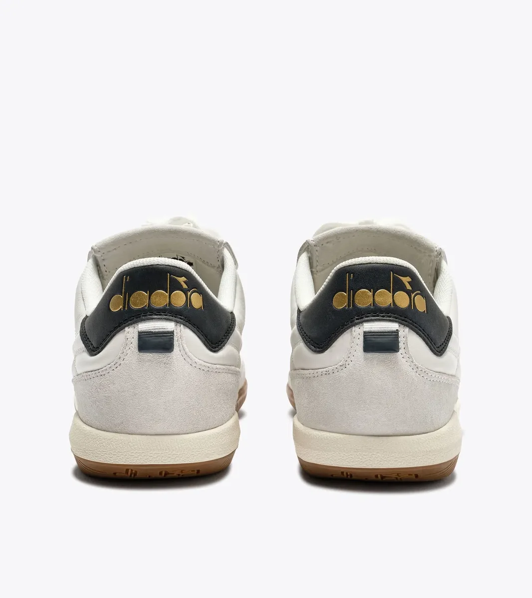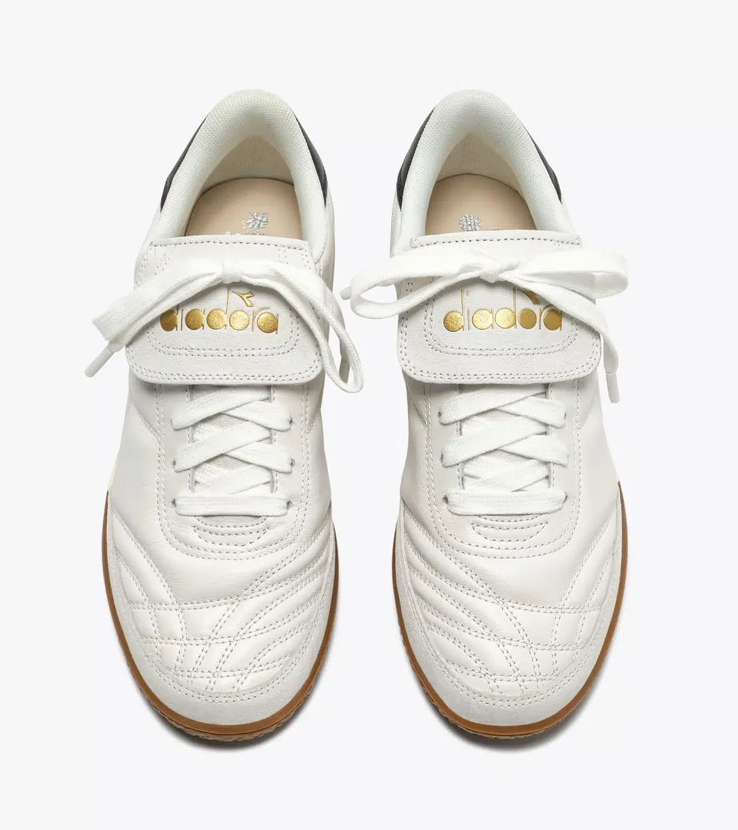 Der Gold Indoor ist aus weichem Leder und Schweinsleder gefertigt. Er ist leicht gepolstert und hat die umgeschlagene Zunge klassischer Fußballschuhe für einen raffinierten, sportlich inspirierten Look. Und die charakteristische Gummisohle, die direkt aus den Handball-Archiven von Diadora stammt, ist das Detail, das Sie seit den 80er Jahren lieben.