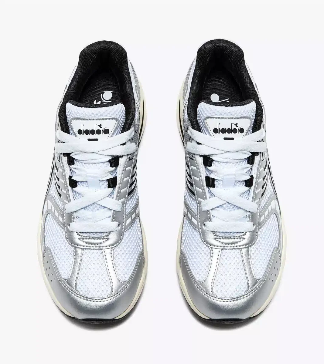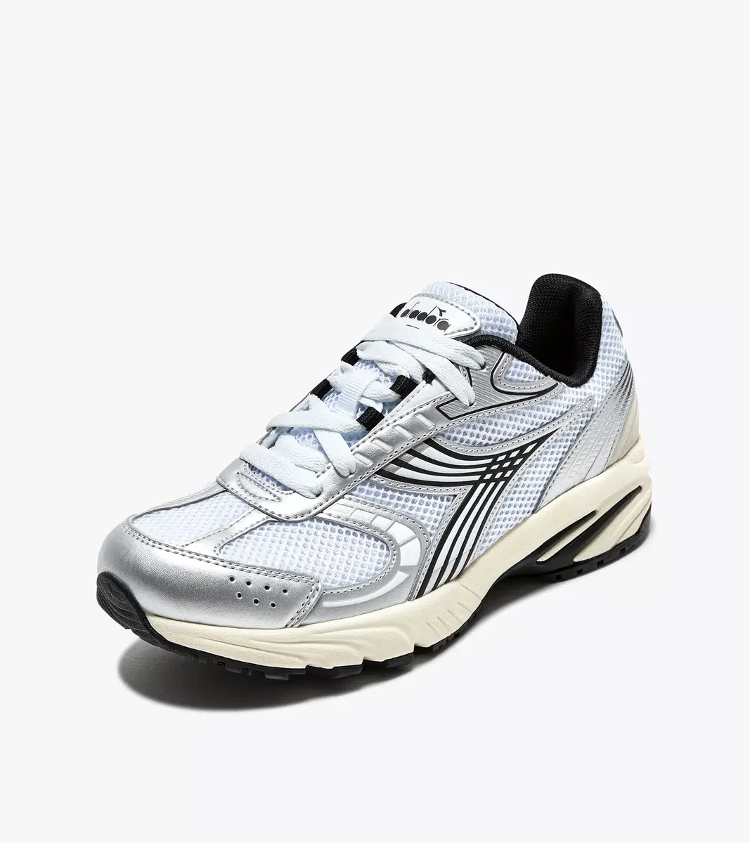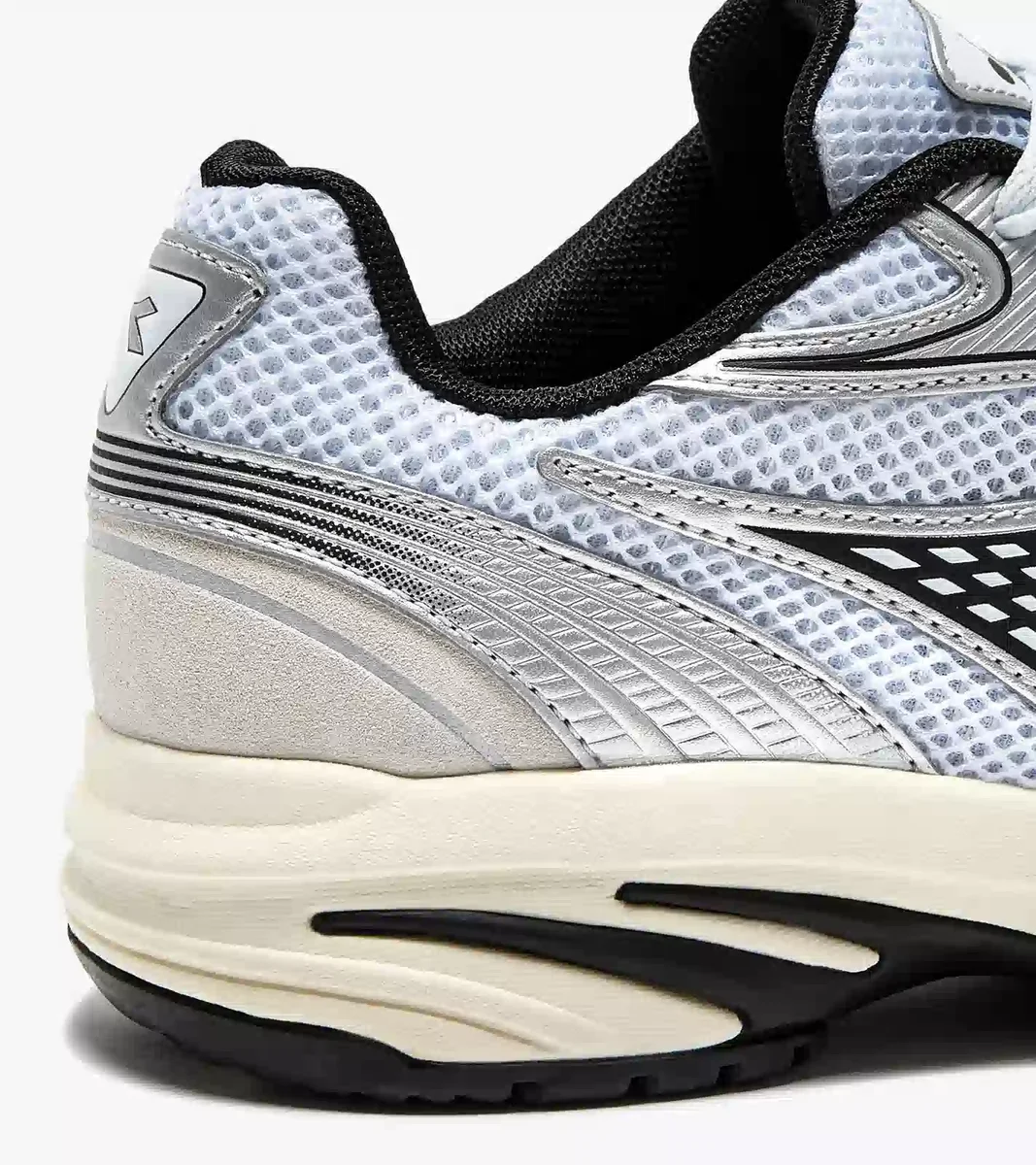 Alle Elemente des Laufstils der 2000er Jahre: Obermaterial aus offenem Mesh, Design der Zwischensohle und silberne Details
