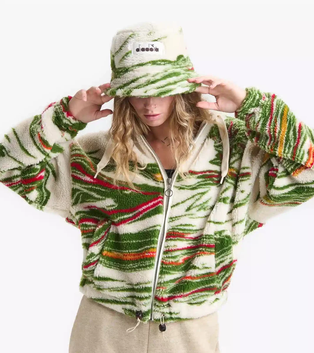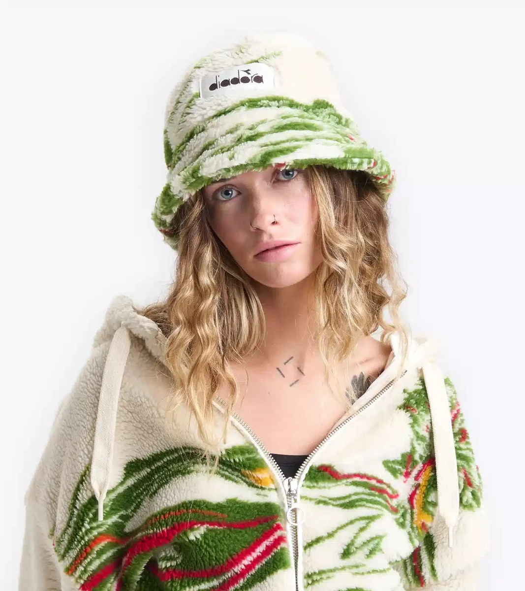 Zusammen mit der italienischen Sängerin Madame, einer der einflussreichsten und beliebtesten Künstlerinnen der Musikbranche, haben wir eine Signature-Kollektion entworfen, die der Natur und ihren Formen Tribut zollt. Die Kollektion wird vollständig in Italien aus recyceltem Polyester hergestellt. Der Bucket Hat ist eines der begehrtesten Modeaccessoires. Wir haben ihn in Weiß mit einem von der Natur inspirierten Muster entworfen. Er ist so weich, dass Sie sich fühlen werden, als lägen Sie mitten im Wald. Kombinieren Sie ihn mit dem passenden Fleece und machen Sie sich bereit für Ihr nächstes Abenteuer!