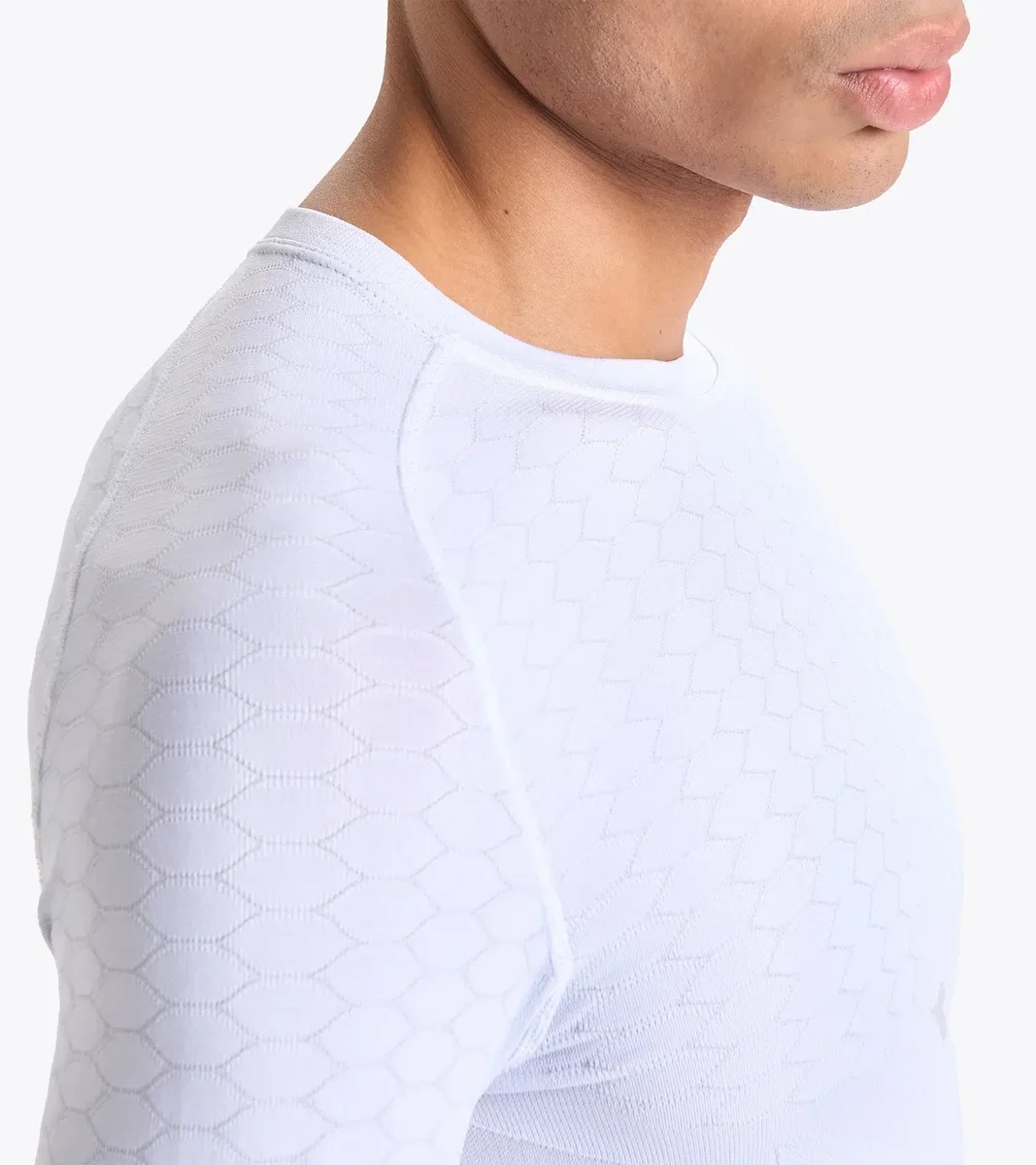 Ein langärmeliges Shirt mit Rundhalsausschnitt aus einer weichen, leichten Mischung aus Polyamid und Polypropylen. Letzteres – Ton in Ton – hat die doppelte Funktion, den Körper trocken zu halten und die Logos hervorzuheben.