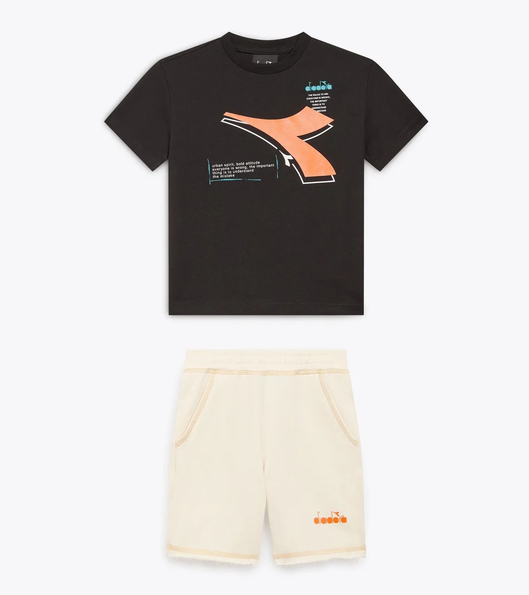 Von der Schulbank direkt ins Geschehen. Mit diesem passenden Sportset sind kleine Jungen sofort bereit, sich in ihren Lieblingssport zu stürzen. Das Outfit ist minimalistisch, aber es mangelt nicht an Details: das kontrastierende Logo auf dem T-Shirt und das Taschenfutter der Shorts, das die Verzierungen des Fregio-Akzents nachahmt.