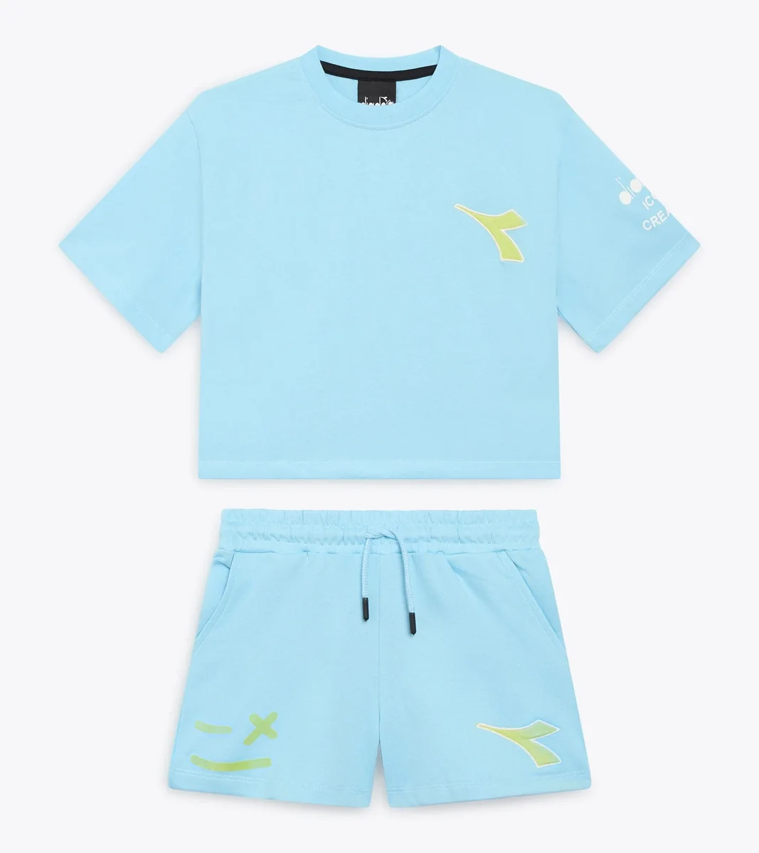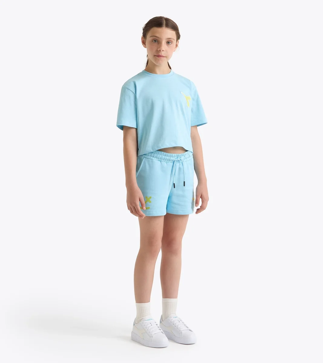 Ein lässiges Outfit für Mädchen, bestehend aus einem kurzen T-Shirt und Shorts mit Stretchbund. Ein vielseitiges und leichtes Outfit ist genau das, was du für kurze Ausflüge oder Abenteuer mit dem Rucksack brauchst!