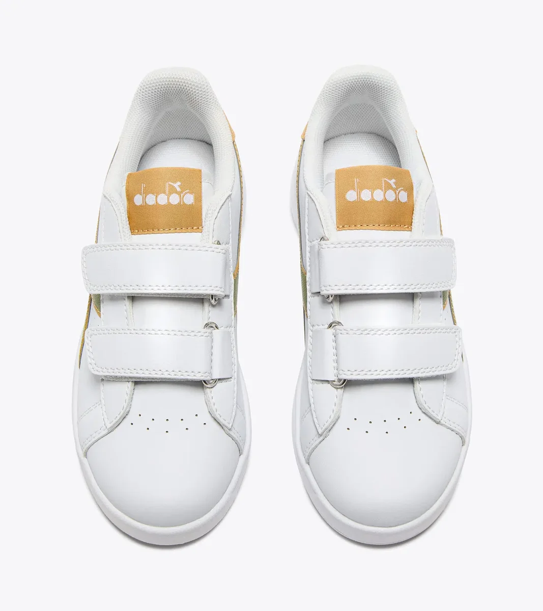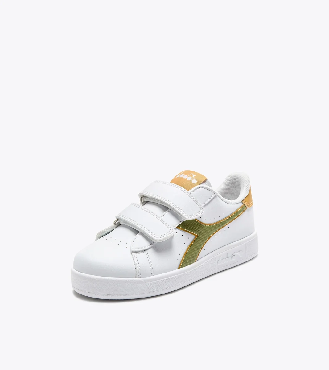 Niedrige, geschlechtsneutrale Kindersneaker mit durchbrochenen Details, praktischem Klettverschluss, passendem Fregio, Zunge und Ferse.