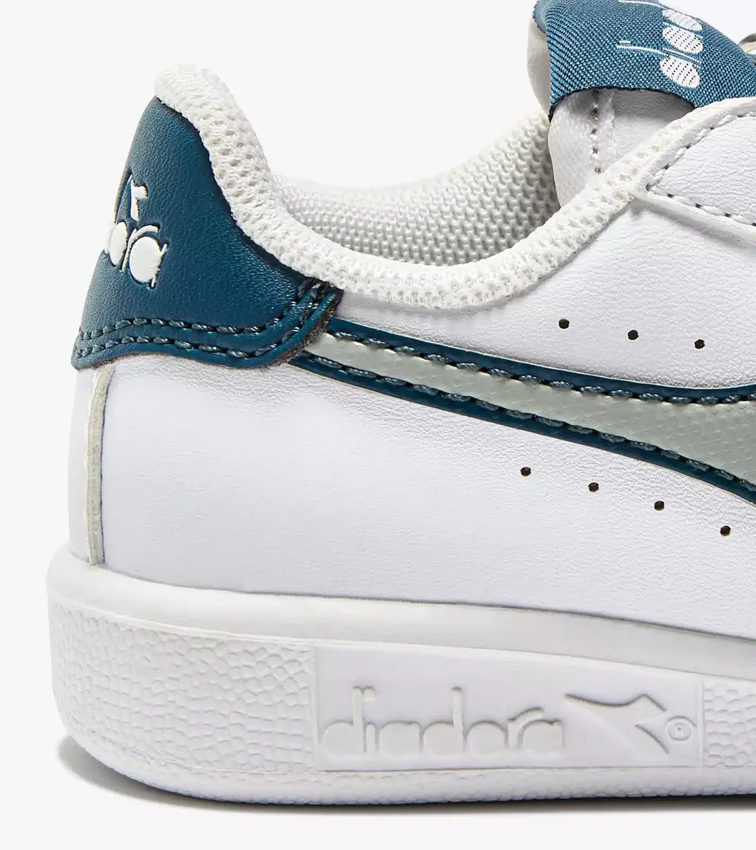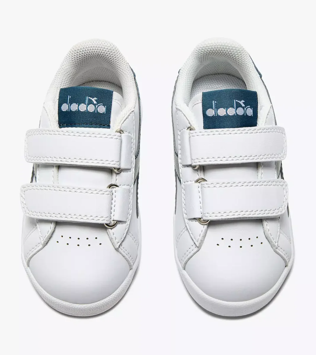 Niedriger Kinderschuh, durchbrochene Details, praktischer Klettverschluss, passender Fregio, Zunge und Rückseite.