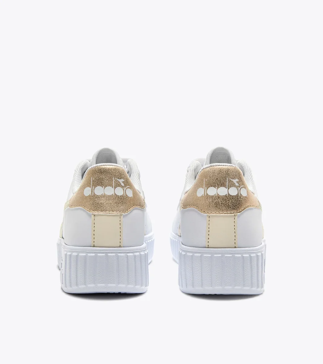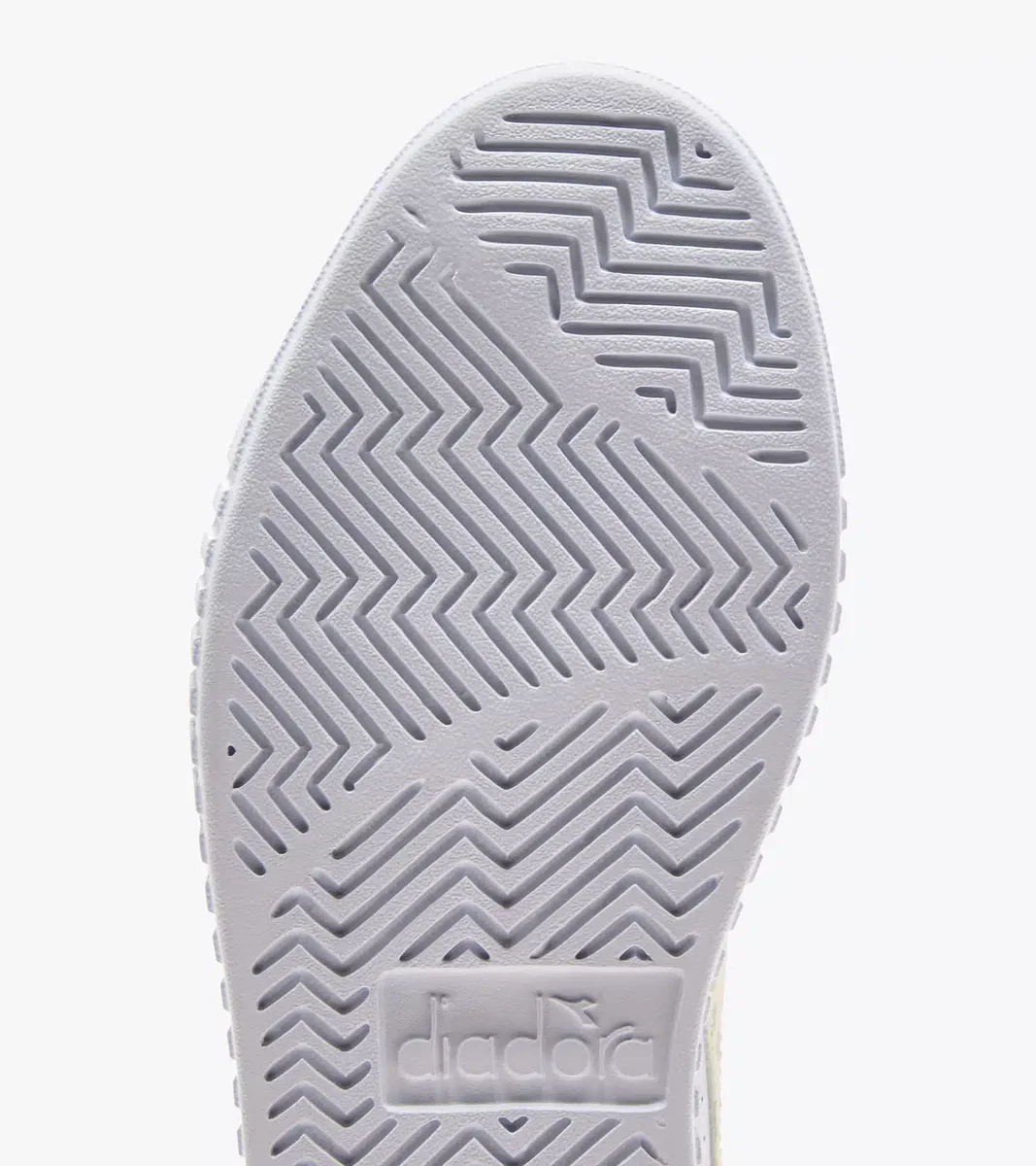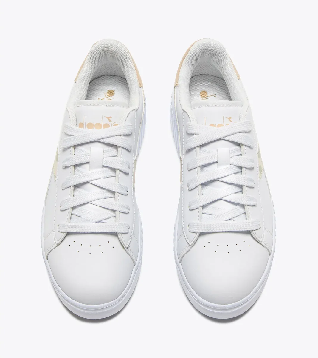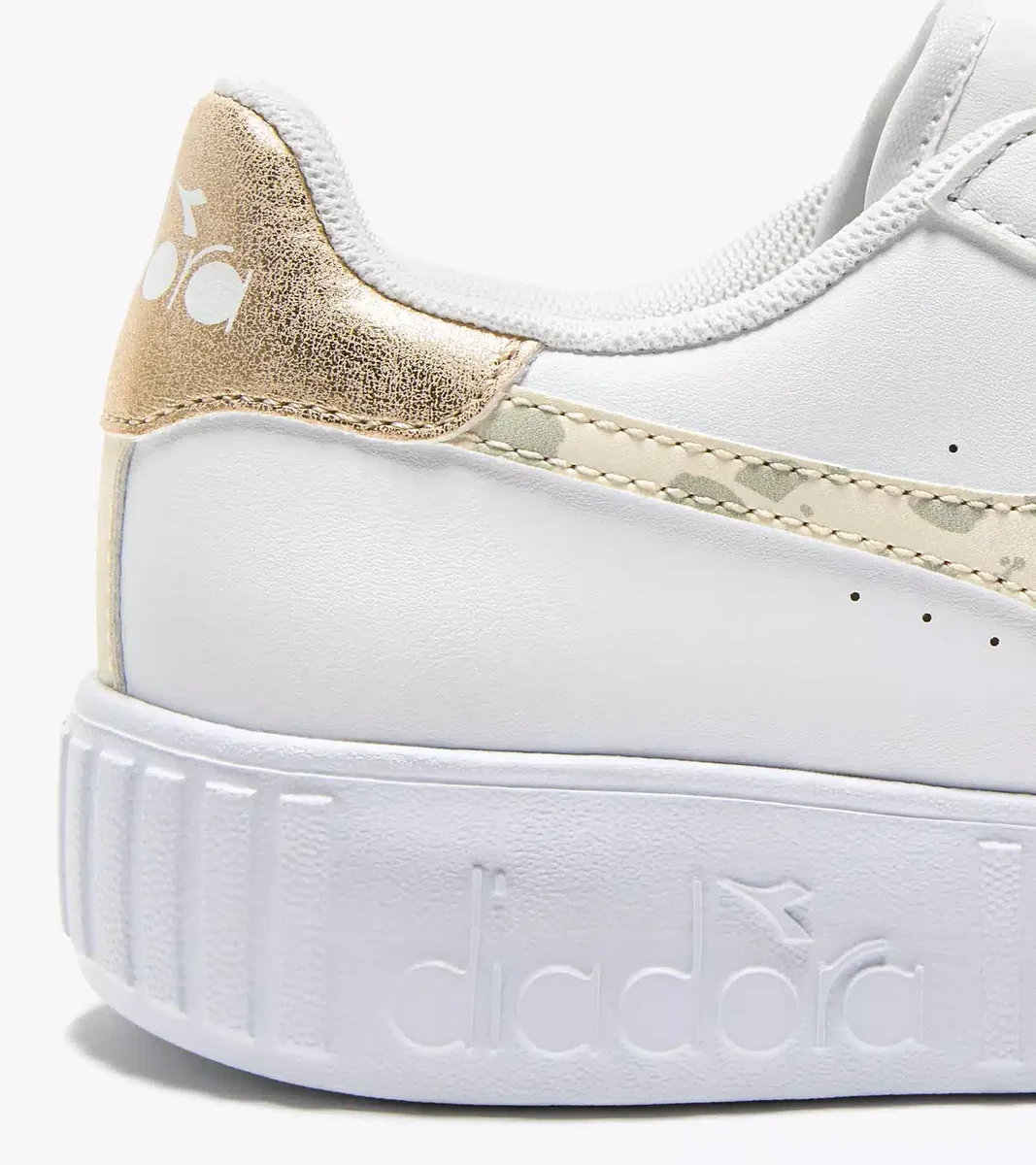 Ein von Kratern inspirierter Print trifft auf laminierte Details, die diesen klassischen weißen Sneakers einen ganz neuen Glanz verleihen. Die Plateausohle? Der zeitlose Touch, der Game Step zu einer Ikone macht.